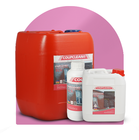 ECS® COUPCLEAN is an acid-based liquid cleaner designed to remove efflorescence from various building façades, especially brick and concrete surfaces. It appears as an opaque liquid, has a purity of ≥ 98%, a pH of 1–2, and a density of 1.11 g/cm³. Due to its acidic nature, it reacts with metals and must be stored in acid-resistant containers.
